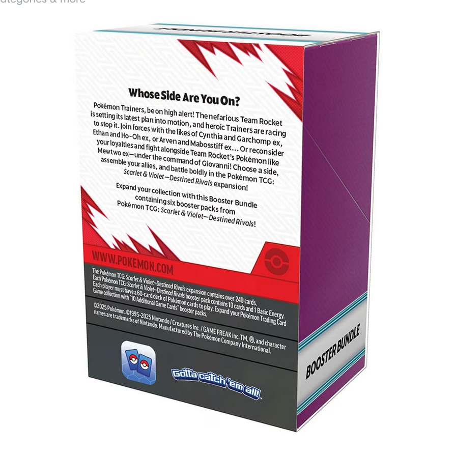 Pokemon Trainers, be on high alert! The nefarious Team Rocket is setting its latest plan into motion and heroic trainers are racing to stop it. Join forces with the likes of Cynthia and Garchomp ex, Ethan and Ho-Oh ex or Arven and Mabosstiff ex… Or reconsider your loyalties and fight alongside Team Rocket’s Pokemon like Mewtwo ex, under the command of Giovanni! Choose a side, assemble your allies and battle boldly in the Pokemon TCG: Scarlet and Violet - Destined Rivals expansion!